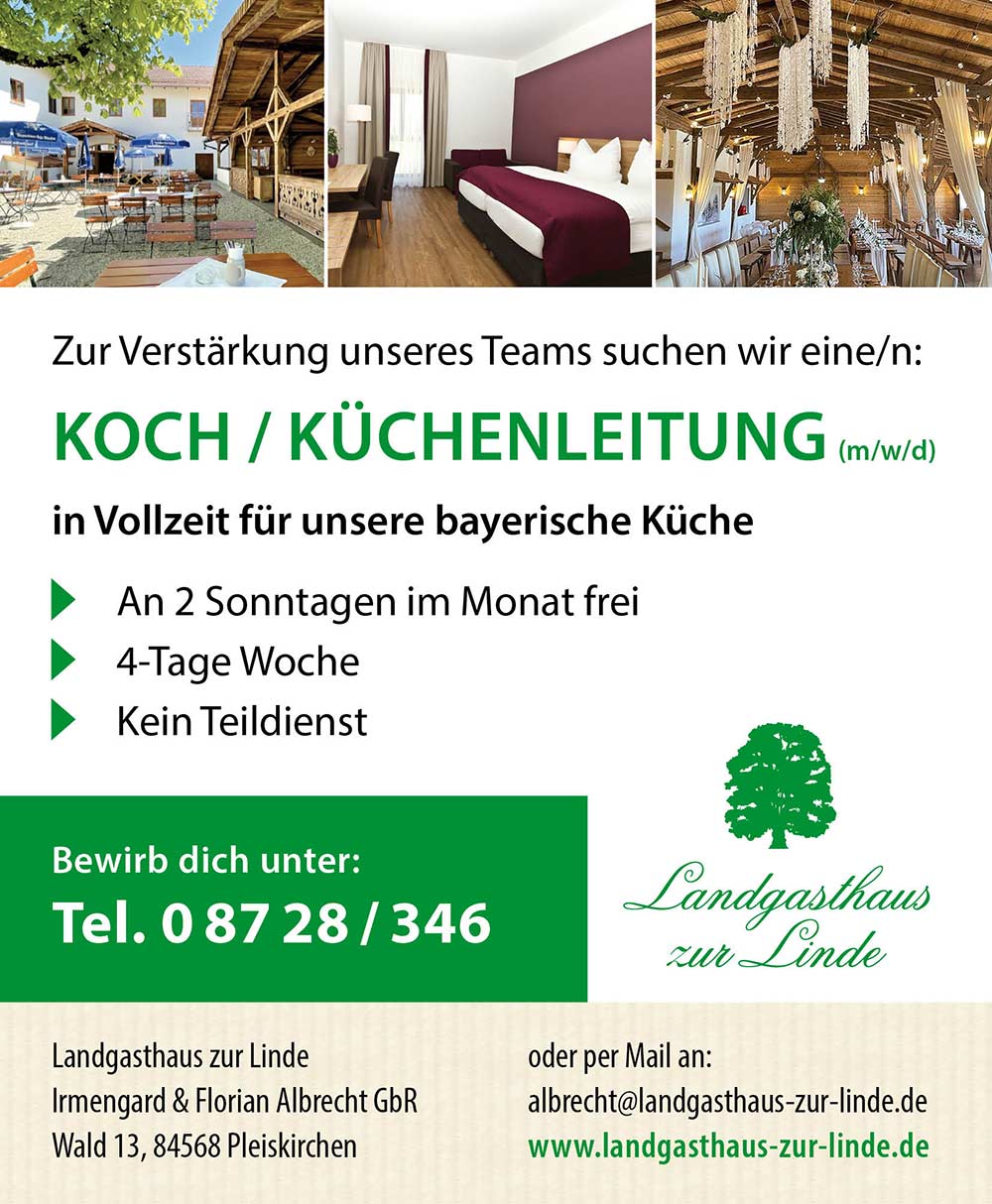 Ihre Bewerbungsunterlagen senden Sie an: albrecht@landgasthaus-zur-linde.deoder telefonisch unter: 08728 / 346
