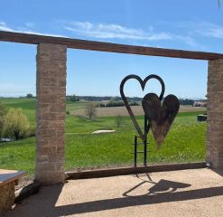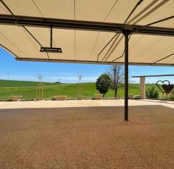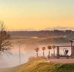 Bei schönem Wetter dürfen sich die Gäste über einen wunderbaren Blick auf die gesamte Alpenkette freuen. Die idyllische Lage und der Blick über die Felder und Wiesen ist garantiert. Mit einer Markise - die mit 14 Meter auf 8 Meter eine enorme Größe aufweist - sind die Gäste sowohl vor Hitze, als auch vor leichten Regenschauern gut geschützt. Heizstrahler sorgen bei kälteren Temperaturen zusätzlich für einen angenehmen Aufenthalt im Freien.